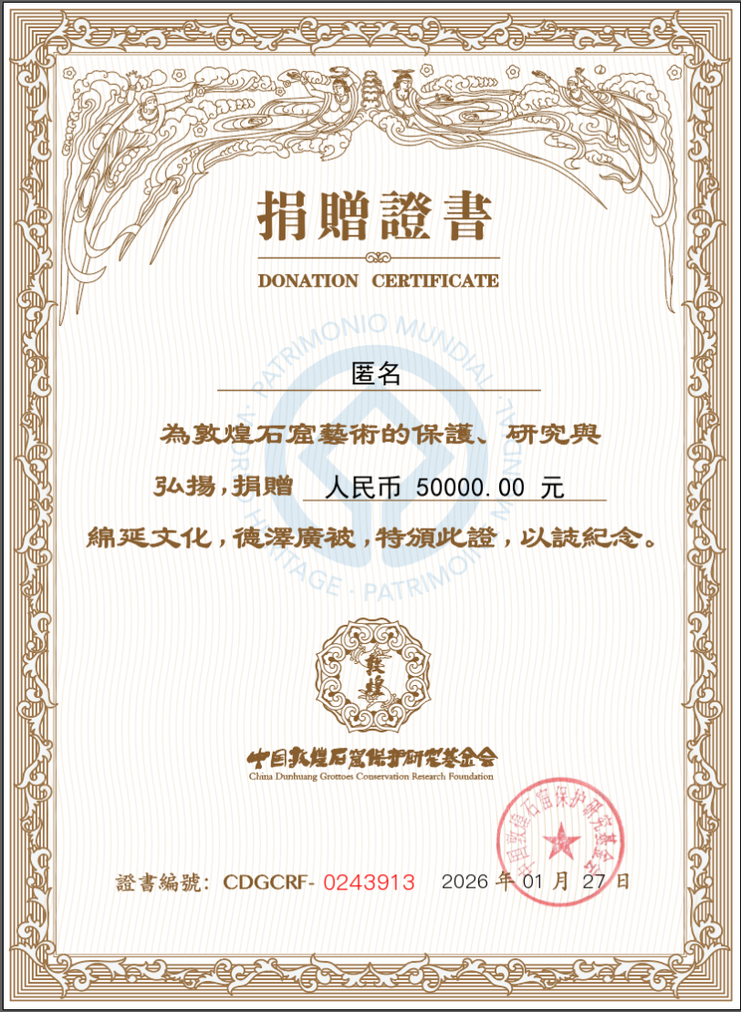 敦煌,是全人类的文化瑰宝。它的存续与光彩,离不开古往今来无数有名或无名守护者的虔诚奉献,也离不开当代社会每一位关心者的支持与助力。这位匿名捐赠者及其家人,正是这当代守护者群体中的光荣一员。他们的善举,是对“坚守大漠、甘于奉献、勇于担当、开拓进取”的莫高精神的生动诠释,也是对基金会工作的莫大信任与激励。